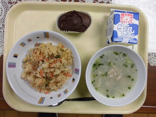 牛乳、キムチチャーハン、サムゲタン風スープ、米粉のココアマフィン