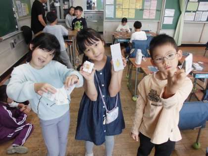 2年生が生活科で「みのまわりのものであそぼう」の学習をしました。輪ゴムを使って自分たちで作ったおもちゃで遊びながら、動きの仕組みにも興味をもつ姿が見られました。3年生の理科「ごむの働き」へとつながる学びです。