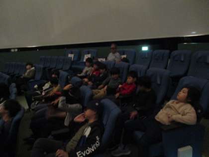 2時間近く体験をしたあと、プラネタリウムをみんなで見ました。アニメを基にした、宇宙の端についての話とオーロラについての話を楽しみました。(視聴中は撮影禁止のため、始まる前の様子です)