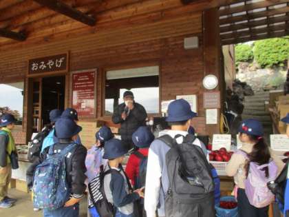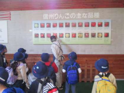佐久市こども未来館を出発し、松井農園に到着しました。ここでは子供たちが楽しみにしていたりんご狩りを体験します。農園の方に挨拶をし、りんごの博物館に寄りながら、りんごがなっている場所まで移動です。