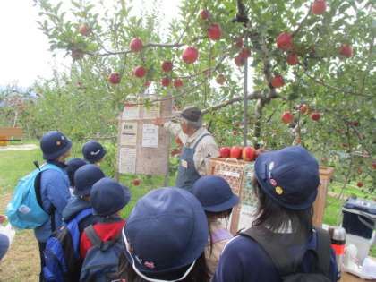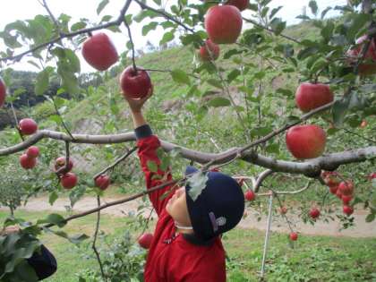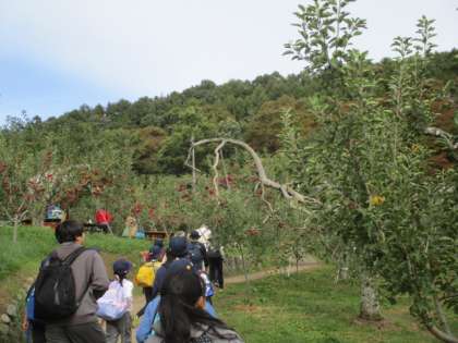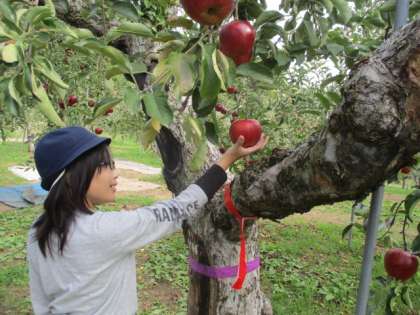 りんご狩りの場所に到着です。りんごの取り方を聞き、試食用のりんごと持ち帰る用のりんごを収穫していきます。いろいろな種類のりんご、どんな味がするでしょうか。