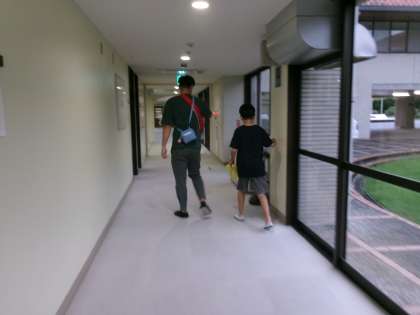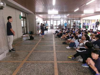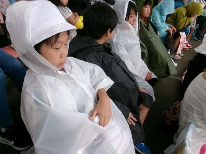 昨夜の雨で地面が濡れていたため、玄関前に集合して、朝会
