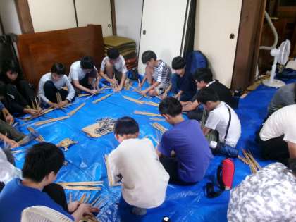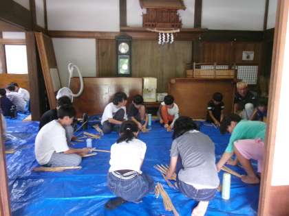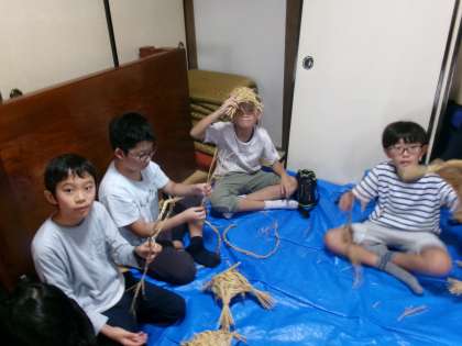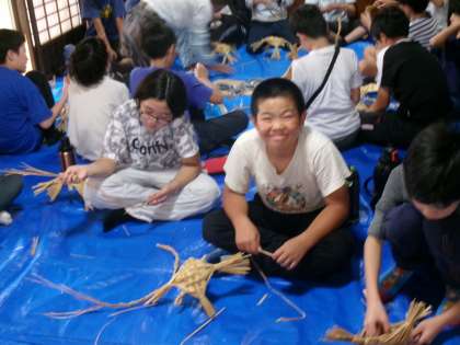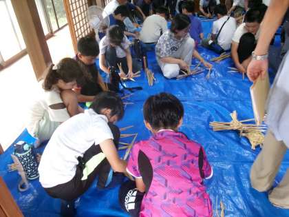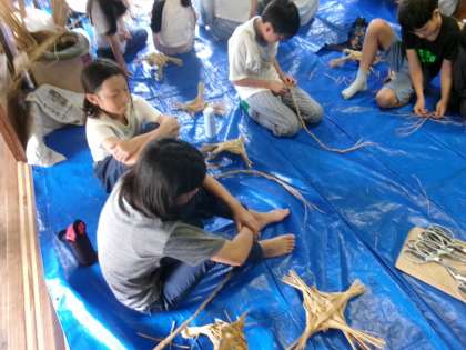 古民家にいるわら細工チームは、スタッフの方の説明をよく聞き、実際作業しながらわらを操っています。