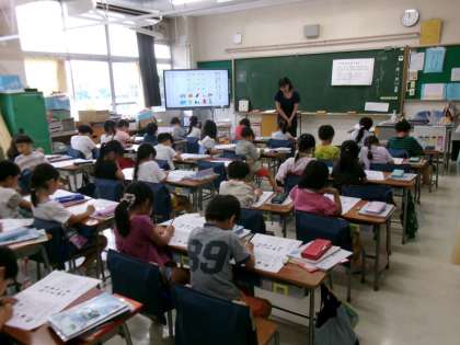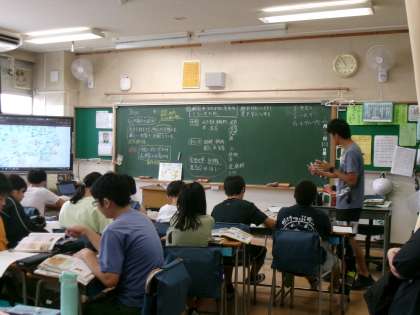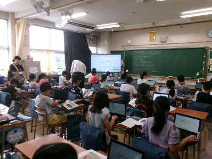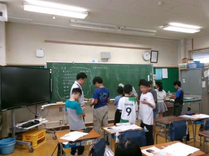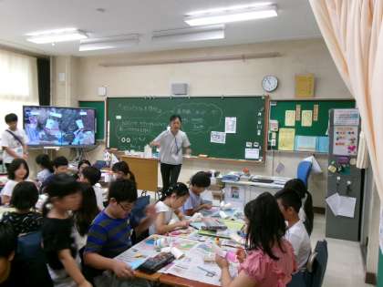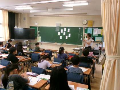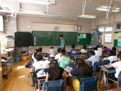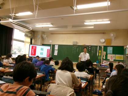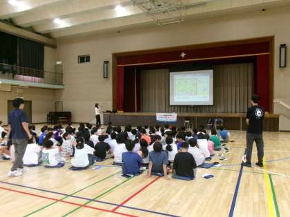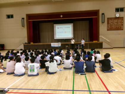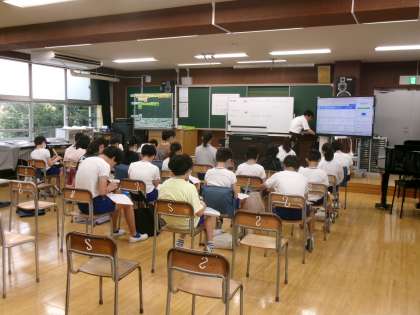 9月10日(水)、5年生はアクトインディ(株)の方をお招きして、移動教室2日目に大房岬で行う海洋学習の事前学習を行いました。まずは海について知ってもらおうと海に関するクイズに挑戦したり、話を聞いたりしました。最後に当日行うフォトテーリングのやり方や注意事項などについて説明を聞きました。知らないことや初めてのことがたくさんあり、当日への意欲が高まりました。