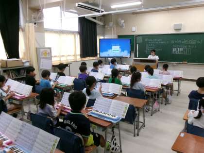 9月10日(水)、1年生はジェンガのリズムやリズムづくりを楽しんだり、けんばんハーモニカの指遣いを練習しました。前半のリズムではジェンガのリズムにのって体を動かしたり、自分たちで「タン・タ・ウン」を組み合わせてリズムを打ったりしました。後半には「ドからソ」までの指遣いを意識してけんばんハーモニカの練習に集中して取り組みました。音をよく聴いて楽しみました。