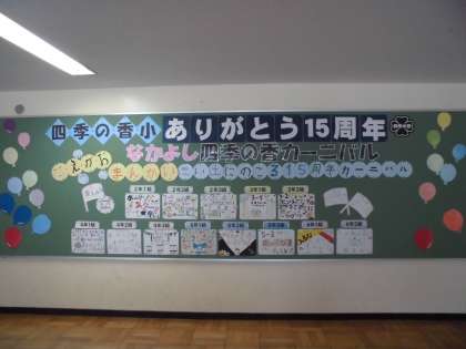 6年生は宮沢賢治の「やまなし」という教材で授業を行いました。この教材では、あえて教科書の挿絵は見せず、やまなしの世界を想像しました。そして、話し合い活動では5月の様子と12月の様子について、イメージを伝え合ったり、共通点や相違点を見つけ出したりしました。話し合いをすることで、より宮沢賢治の世界観に入り込み、想像力を働かせることの楽しさを感じていました。 この授業を通して、子供たちは話し合いの中で友達の意見に触れ、様々な考え方があることの面白さを実感することができました。 15周年なかよし四季の香カーニバル