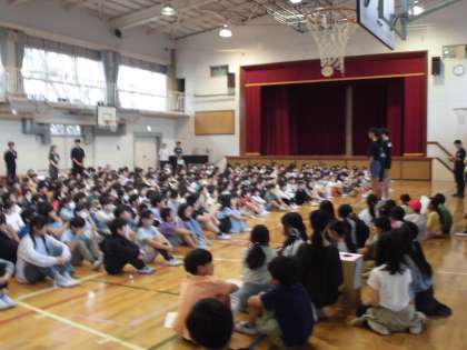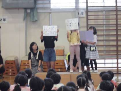 普通のジャンケン列車と違うのは、ジャンケンで負けた人だけ、勝った人の後ろにつきます。だから、一度負けても復活のチャンスがあるのです。繰り返して最後まで先頭だった人がチャンピオンです。 集会委員会のお手本の後、1年生から6年生までいっしょにゲームを楽しみました。最後に、集会委員が、今日の児童集会の振り返りをしました。とても楽しい児童集会でした。