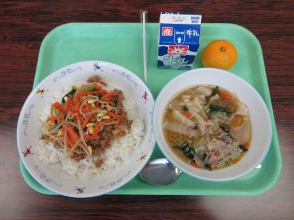【本日の献立】 「ビビンバ」「ワンタンスープ」「果物(みかん)」「牛乳」 ☆ 「給食だより」から ☆ 今日、10月16日(木)は「世界食糧デー」です。世界食糧デーは、世界 中の一人ひとりが基本的人権である「すべての人に食材を」のもと、 世界に広がる栄養不良や飢餓、極度の貧困を解決していくことを目的 として、昭和56年(1981年)に国連が制定した日です。 日本では、平成20年(2008年)から「世界食料デー」のある10月を「世 界食料デー月間」として、飢餓や食料問題の解決に向けてシンポジウ ムや集会、展示会などのイベントが開催されています。 10月14日(火)