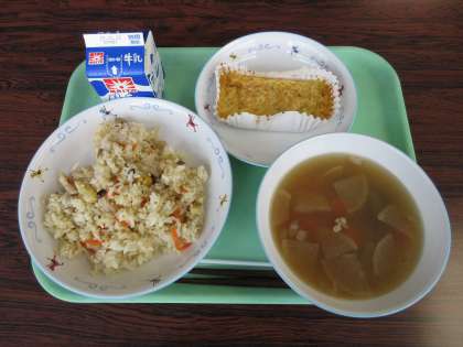 【本日の献立】 「秋色混ぜご飯」「厚焼きたまご」「吉野汁」「牛乳」 ☆今日は、久しぶりに青空を仰ぎ見ることができました。雨上がりの朝 は、葉に露が降りて秋の深まりを感じました。4階からは富士山の雄 姿も見ることができました。標高の高い山や北の地方では、そろそろ 初霜・初雪の便りが届き始める頃でしょうか。 10月16日(木)