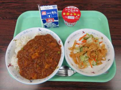 【本日の献立】 「キーマアルビカレー」「パリパリサラダ」「元気ヨーグルト」 「牛乳」 ※今日は「文化発表会応援献立」です。 ☆ 「給食だより」から ☆ 今日は、明日の合唱コンクールの皆さんの活躍を祈って「合唱コンク ール 応援献立」です。のどに潤いの幕を作るはちみつを使用したド レッシングで、人気メニューのパリパリサラダを作ります。喉の調子 を整えて、素晴らしい合唱を響かせてください。 10月20日(月)