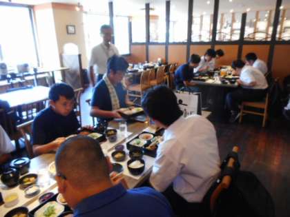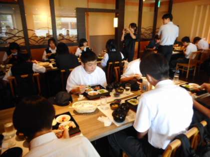 まもなく修学旅行も終わりです。京都駅集合の前に昼食をいただきます。10組は京都駅近くにあるホテルのレストランでいただきました。食後はお小遣いの計算など、学習のまとめをしました。思い出もおなかもいっぱいです。