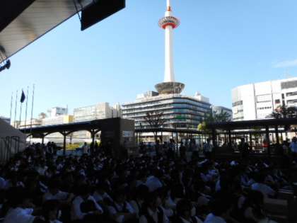 全員が無事に京都駅に集合し、解散式が始まりました。お世話になった方々に感謝をします。後ろには、京都タワーも見えます。もうすぐお土産を持って帰ります。