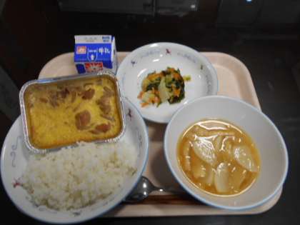 ご飯、魚のフライマリアナソースがけ、しらす入りコールスローサラダ、じゃがいもとレンズ豆のスープ、牛乳