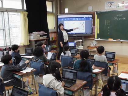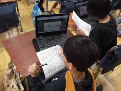 1年生がカタカナの学習に励んでいました。今日は「促音」と「拗音」の学習です。小さい「ッ」や「ャ」などですね。タブレットでオクリンクを使いながら、みんなで問題を考えたり、見つけたカタカナを使った文字を出し合ったりしました。1年生って、この1年間でひらがなもカタカナも漢字も学びます。これは相当な学習量です。しかも、カタカナって意外と難しいですよね。大人でも、拗音などは一瞬詰まるときがあると思います。みんなでいろんな言葉を並べながら、学びを深めていました。おまけ話ですが、滅多に使わない「を」のカタカナ「ヲ」。これ、書き順わかりますか?おそらく、ほとんどの大人が間違えて覚えてます。気になる人は調べてみてください。