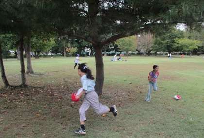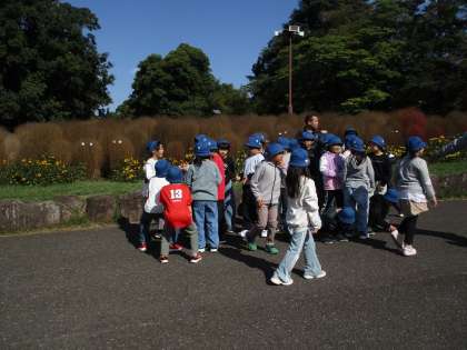 長縄、鬼ごっこ、しっぽとり、広い芝生でたくさん体を動かして楽しみました。先生たちが出すミッションにもチャレンジ!帰りは少し雨が降りましたが、あまがっぱを着て元気に帰ってきました。