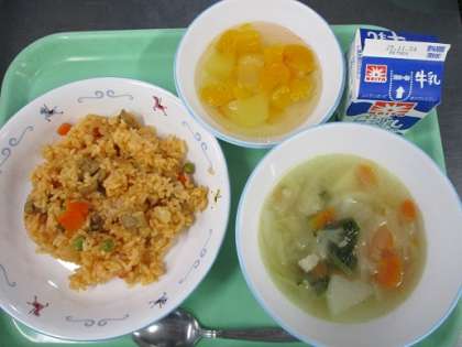 今日はリクエストアンケートのデザート部門で1位だった「サイダーパンチ」です。缶詰のフルーツに寒天やシロップを加えて作りました。フルーツポンチとは違ってサイダーが入っているのでしゅわしゅわした食感になっています。子供たちは大喜びでした。