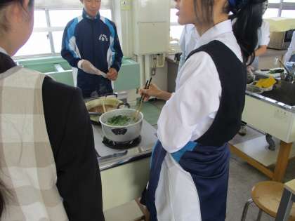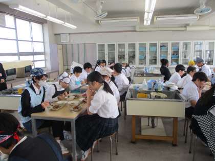 さかなを手で触ることになれなく、苦労していた生徒もいました。どの班もおいしくでき、ご飯がほしいと声もあがっていました。