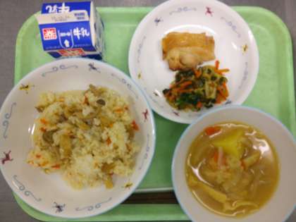 ・麦ご飯 ・牛乳 ・鶏肉の香味焼き ・切り干し大根の炒め煮 ・生揚げの味噌汁 今朝はとても冷え込み、秋本番、という感じになってきましたね。昨日から始まった合唱練習の歌声も冷たい空気に乗ってよく響いています。今日は鶏肉の香味焼きが味噌味のソースと絶妙な味付けで美味しくいただきました。ご馳走様でした。 ![]() ![]() 10月14日(火)の給食![]() ![]() ・焼き肉ガーリックライス ・バジルビーンズポテト ・野菜スープ ・牛乳 焼き肉ガーリックライスは、野菜と豚肉を炒めて調味し、ご飯に混ぜ合わせたものです。野菜はにんじんとタマネギ、それからゴボウも入っています。野菜はみじん切りにしているため、食べやすくなっています。 バジルビーンズポテトは、茹でた大豆と、じゃがいもを素揚げし、油切りをした後に、バジルと塩を合わせて振りかけたものです。 10月10日(金)の給食