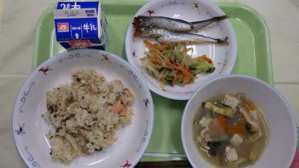 秋鮭ごはん 焼きししゃも 野菜のごまあえ どさんこ汁 牛乳 【郷土料理 北海道】 秋鮭は、9月頃から産卵のために川に戻って来る鮭を指します。身がふっくらとしていて、脂も控えめなのが特徴です。給食では秋鮭ごはんでおいしくいただきました。 ししゃもは、川で生まれて海で育つ回遊魚です。漢字で「柳葉魚」と書き、アイヌの神様により柳の葉から作られたという逸話が残されています。 どさんこ汁のどさんこは、「道産子」と書き、北海道で産まれたという意味です。北海道でとれたじゃがいも、コーン、にんじんなどで作る汁ものです。 北海道の豊富な食材をふんだんに盛り込んだおいしい給食でしたね。