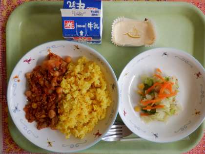 チリコンカンライス キャベツとコーンのサラダ パステルカルローダ(焼) 牛乳 【世界の料理 メキシコ】 チリコンカンは、スペイン語の「唐辛子(チリ)」と「牛肉(カルネ)」を意味する「チリ・コン・カルネ」が語源です。ひき肉、豆、トマト、玉ねぎなどをチリパウダーなどのスパイスで煮込んだものです。給食では、ターメリックライスと一緒においしくいただきました。 そしてメキシコのデザート「パステルカルローダ」は、本来はビスケットとクリームチーズを重ねて作ったものです。給食ではクリームチーズのみでしたが、レモンの酸味が程よく効いていて、チリコンカンライスのスパイシーな後味をさわやかにしてくれました。