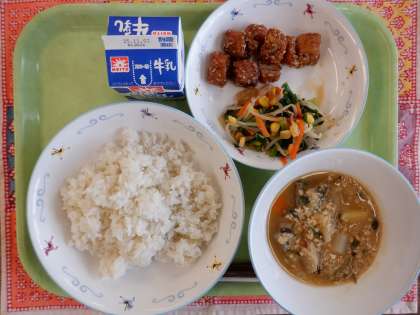 麦ごはん 魚のたれがらめ 小松菜とコーンのお浸し 呉汁 牛乳 【魚を食べよう献立】 日本は、周りを海に囲まれているだけでなく、清流や湖沼にも恵まれていることもあり、多種多様な魚介類を食べることができる国です。 今日の給食の「魚のたれがらめ」は、かつおを一口サイズの角切りにし、甘辛いたれでからめたものでした。カリッとした衣に味が染み込んで、ご飯に良く合いました。 「呉汁」は、大豆を水に浸してすりつぶした「呉」または「醐」と言われるものを、みそ汁に入れたものです。秋に収穫された大豆を使うことが多いため、秋から冬にかけて良く食べられるそうです。体が温まるおいしいおみそ汁でした。