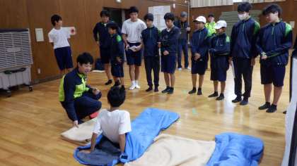 第2体育館では、AEDを使っての心臓マッサージ体験を行いました。生徒たちは、消防署の方に教えていただき、心臓マッサージが上手にできるようになり、ほめていただきました。また、避難所で使用する、寝袋や簡易テントを見て、実際に寝てみました。寝袋はかなり薄手でした。