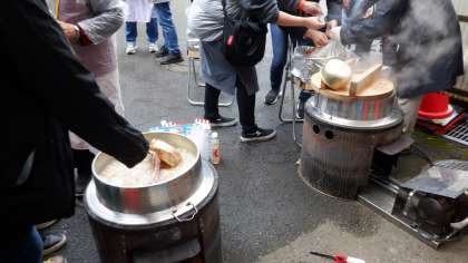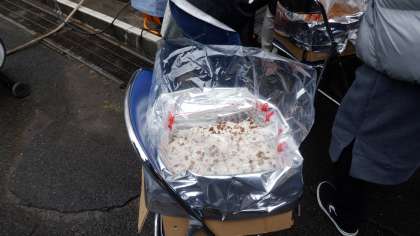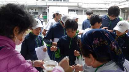 炊き出し訓練では、非常用アルファ化米の炊き込みご飯と、豚汁を作りました。豚汁は、手作りで具材がたっぷりと入っていて、とてもおいしかったです。当日は寒かったので、温かい豚汁は、生徒たちにとても人気がありました。