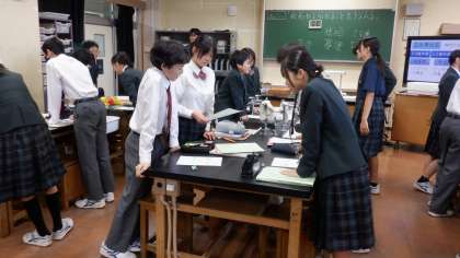 3年生の理科は、「電流を取り出す条件を探そう」という実験を行いました。塩酸の水溶液の中に、2枚の金属板を入れ、プロペラの回転と電流計で電流が流れることを明らかにします。生徒たちは、「回った!」「回らない!」「泡が出て、濁っている!」と確認して、金属の組み合わせを記録していました。