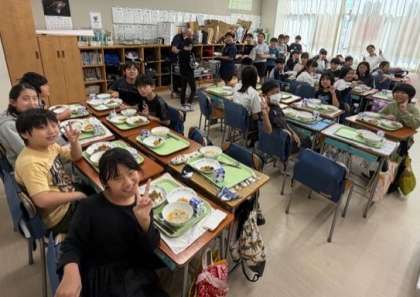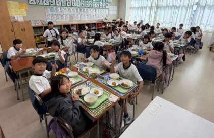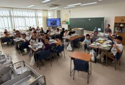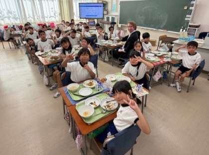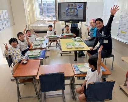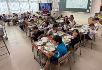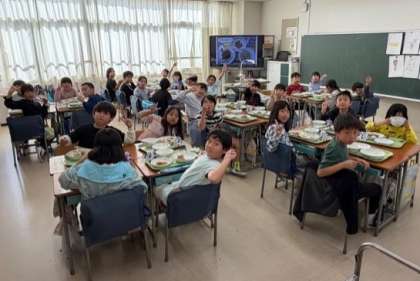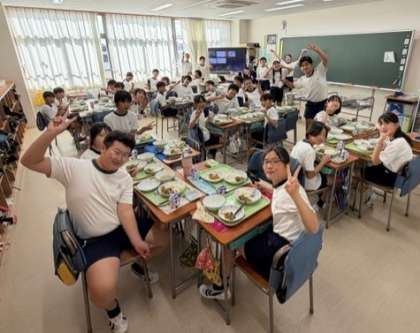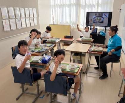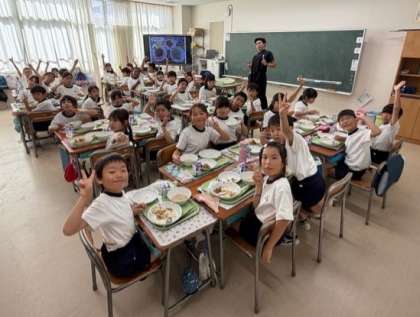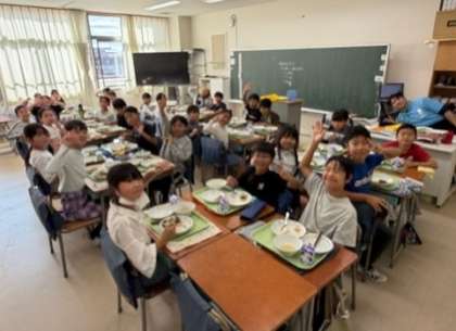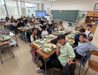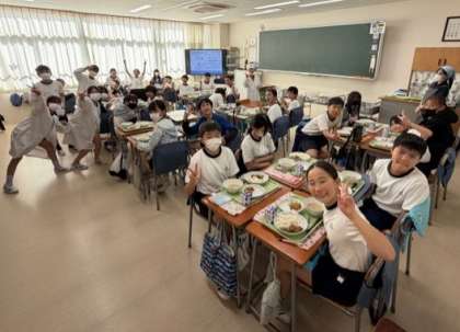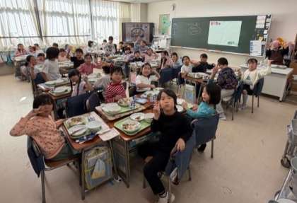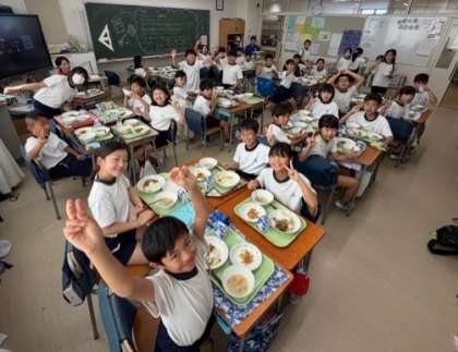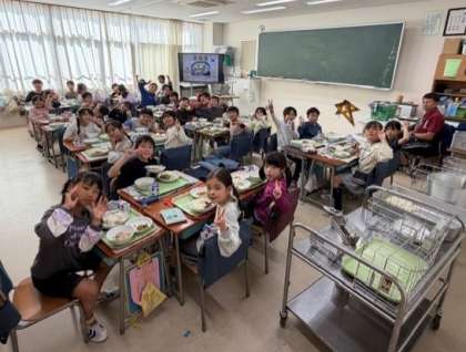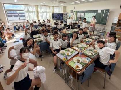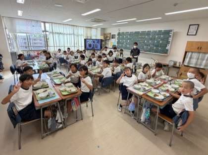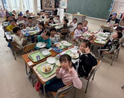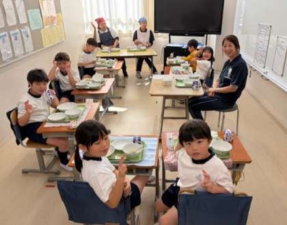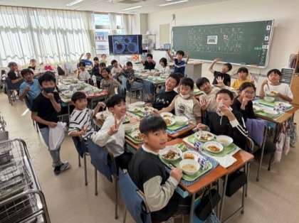 教室に戻って給食です。初めての運動会、一所懸命走って、みんなで楽しく踊りました。みんなで、はい、ポーズ。