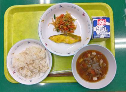 きびご飯 タンドリーフィッシュ  野菜のツナあえ  大根と生揚の味噌汁 牛乳