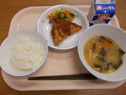 【献立】ごはん・牛乳・アジフライ・じゃがいものみそ汁・キャベツの香り和え