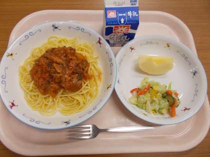 【献立】ツナのトマトソースパスタ・牛乳・イタリアンサラダ・くだもの(りんご)