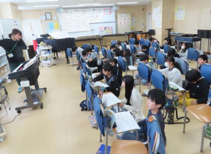 お祭りや生活の中で歌われている民謡。声、掛け合い、はやし言葉、拍に注目し、今日は祭りや仕事を表現した民謡を聴き比べています。