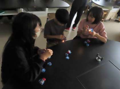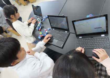 手回し発電機で電気を起こす実験。気付いたことをタブレットに打ち込み、情報を共有しています。これから学習課題を決めていきます。