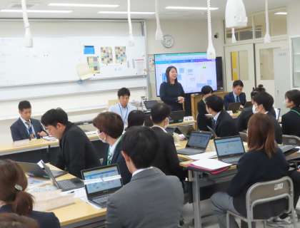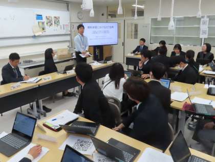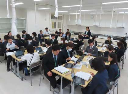 授業の研究協議会では、分科会からの提案、本日の授業についての意見や疑問をタブレットへ入力し、集約された意見をもとにグループ討議を行いました。