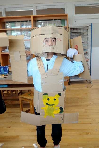 5年生の図工「だんボールで、試して、つくって」では、段ボールでそれぞれの作りたい物を考え、製作しています。一人一人、オリジナリティあふれる作品を作っており、お互いに見せ合って楽しみながら活動をしています。子供の想像力で作られた作品はどれもすてきな物ばかりです。