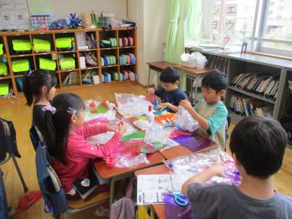 1年生の図工では、ビニール袋の中に、カラーセロハンを入れたり、張ったりして生き物を作りました。完成したクラスから、窓に飾っていく予定です。光に当たってキラキラ輝く生き物たちが楽しみです。