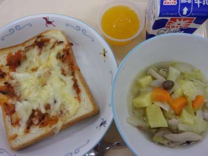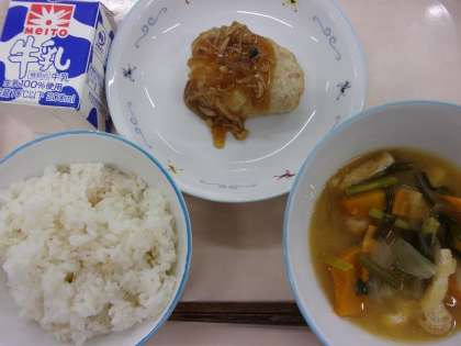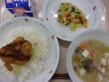 今日は、明日に予定されている運動会を応援する意味で、「かつ丼」にしました。「敵に勝つ」ということで、試合や大会の前に食べることがあります。カツに使用した肉は、豚のヒレ肉で、脂肪分が少なく柔らかい肉質が特徴です。お肉を食べた分、野菜もしっかりと食べてもらいたいので、キャベツをそえています。