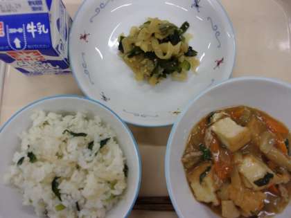 主食は「大根菜めし」です。菜めしに緑色の野菜が入っています。これは“もみ菜”といって、大根を育てる過程で間引いた小さな大根のことで、主に葉っぱのことをいいます。