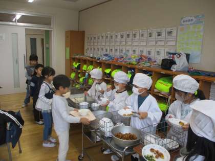 給食当番も盛り付けが上手になり、給食準備が早くなってきました。栄養士さんが、季節ごとに旬の食材やメニューを考えてくださるので、みんなで、食べ物や食材について話をすることもでき、よい食育になっています。