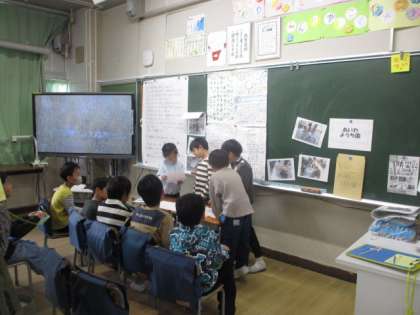 2年生が町探検のまとめに入っていました。グループごとに話し合い、模造紙にまとめていました。お店や施設の様子や感想などを記入していました。発表会をぜひ見たいと思っています。 4年生は昨日の車椅子、高齢者体験を振り返っていました。実際に体験してみて、どんなことに気付いたかなどを発表していました。体験することで、気付くことがたくさんあるようです。 10月27日(月)の学校の様子