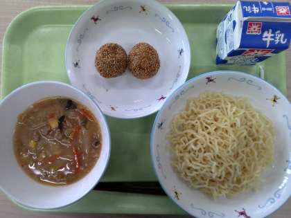 ・味噌ラーメン ・さつまいものごま団子 《ランチタイム》 ごま団子は、白玉粉で作ったもちもちの生地に、あんこを包んで油で揚げた中国の料理です。 給食では、あんこは包まず、旬のさつまいもで作った生地に、ごまをつけて揚げました。 |