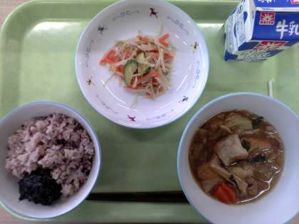 ・五穀おこわ ・海苔の佃煮 ・厚揚げの旨煮 ・みそドレサラダ 《ランチタイム》 今日の「五穀おこわ」には、お米のほかに、もち米、赤米、黒米、きびの合計5種類の穀物を混ぜて、炊いています。ご飯のお供の定番、「海苔の佃煮」と一緒に食べましょう。 11/11 2年 九九カード配り