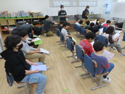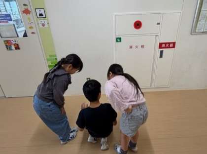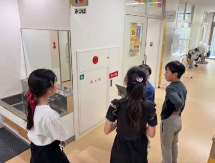 火災から生活を守る校舎内の設備を調べています。火災報知器、非常口、今まで気にしていなかった設備を、改めてじっくりと見ています。