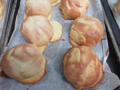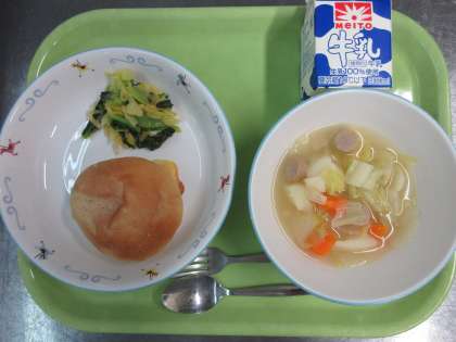 今日は、ビスキューイパンを紹介します。 ビスキュイは、フランス語で二度焼くという意味があります。丸パンの上にビスケット生地をぬって焼き上げた甘いパンです。パンの表面はサクサク、パンはふわふわで違う食感が楽しめます。 今日の給食では、パンの上にバター、砂糖、卵をぬって焼きました。 甘いパンは、子どもたちにも大人気でした。