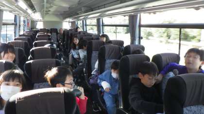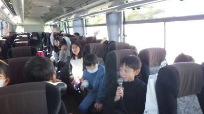 バスに乗り込みます。 早朝からたくさんの保護者の方々のお見送りありがとうございました。 早速、バスレク係が頑張っていました。