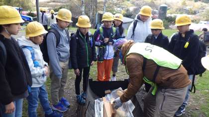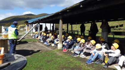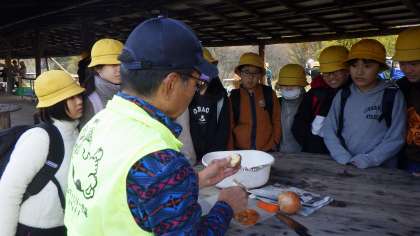 まず、係の方から飯盒炊飯の説明を聞いています。