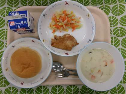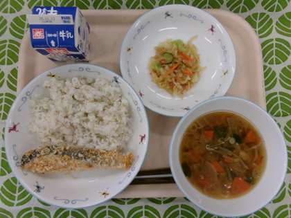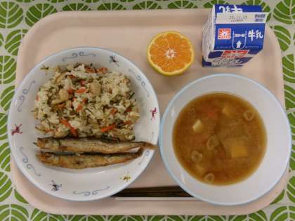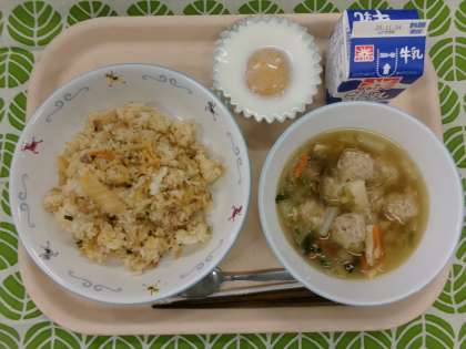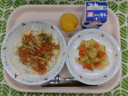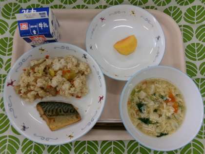 秋の香りごはんは、さつまいもや栗、きのこなどを使って季節感のある混ぜご飯にしました。彩りもよく、見た目も楽しめる給食でした。