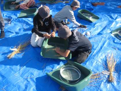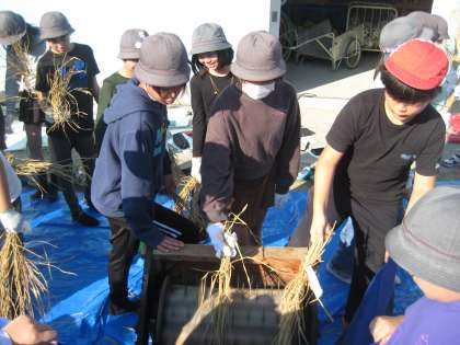 春から育ててきたバケツ稲の脱穀や精米をしました。
