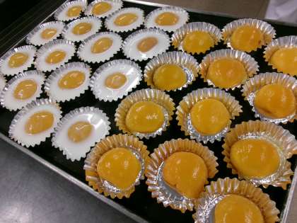 おかしなめだまやきは、見た目は「めだまやき」ですが、食べるとデザート、のお菓子なメニューです。真ん中に黄桃をのせたカップにミルクゼリーを流し入れると・・・まるでめだまやきのようになります。